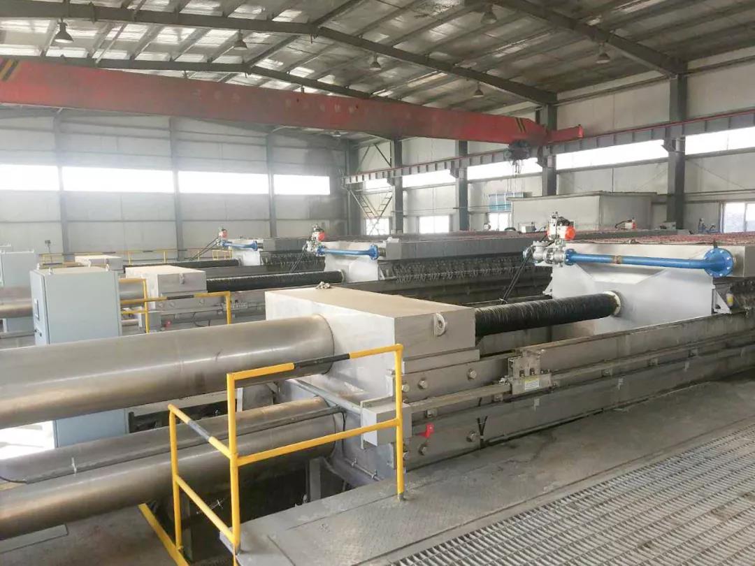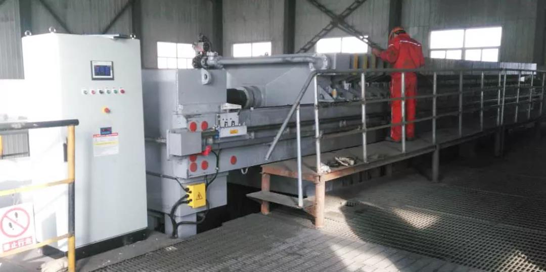采用景津2000型700平方單室進(jìn)料壓濾機(jī) 3臺(tái),每個(gè)循環(huán)50分鐘,濾餅水份15-16%。